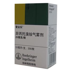【药理作用】爱全乐(Atrovent)是一种具有抗胆碱能(副交感)特性的四价铵化合物。临床前试验显示其通过拮抗迷走神经释放的递质乙酰胆碱而抑制迷走神经的反射。抗胆碱能药物可阻止乙酰胆碱和支气管平滑肌上的毒蕈碱受体相互作用而引起的细胞内环一磷酸鸟苷酸(cGMP)浓度的增高。 吸入爱全(Atrovent)的支气管扩张作用基本上是局部的、吸入部位特异性的作用,无全身性作用。 对慢性阻塞性肺部疾病(慢性支气管炎和肺气肿)引起支气管痉挛的患者进行90天的观察研究,治疗后15分钟即产生显著的肺部功能改善(FEV1和FEF25-75%增长15%或15%以上),1-2小时后达到峰值,对大部分患者其持续作用可达6小时。 在90天的对照研究中,40%与哮喘有关的支气管痉挛的患者吸入爱全乐后肺功能明显改善(FEV1 增加15%或15%以上)。 临床前与临床研究证实爱全乐(Atrovent)对气道粘膜分泌、纤毛的粘液清除作用或气体交换均无不良作用。 对一些啮齿类和非啮齿类的动物进行了观察期为14天的急性毒性试验。 吸入给药时,豚鼠的最小致死剂量为199mg/kg,大鼠给予剂量11.5mcg/l/小时 q.i.d.或48mcg/kg/4小时没有引起死亡。口服和静注的LD50比吸入的最小致死量高。小鼠(口服)LD50为2050mg/kg,狗(静注)LD50为17.5mg/kg。 与较高的静注毒性相比,较低的口服毒性说明药物胃肠道吸收较差。 长期服用的动物试验分别在大鼠、家兔、狗和罗猴上进行。 对大鼠、狗和罗猴均进行了长达6个月的吸入研究,未见不良反应的剂量(NOAEL)分别为0.384mg/kg/天,0.4 mg/kg/天和0.8 mg/kg/天。组织病理学检查未发现支气管-肺部系统出现与本品相关的病理损害。大鼠给药18个月后未见不良反应的剂量(NOAEL)为0.5 mg/kg/天。 爱全乐的水溶液(48 mcg/kg/4小时)经大鼠吸入使用的局部耐受性非常好。 豚鼠试验既无主动过敏反应也无被动皮肤过敏反应发生。 体外细菌致突变试验(Ames试验)未发现致突变性。体内试验的结果(微核试验、小鼠显性致死试验、中国仓鼠骨髓细胞的细胞质基因试验)未显示用药后增加染色体的畸变率。 在小鼠和大鼠的长期试验中未发现致瘤性或致癌性。 为研究爱全乐(Atrovent)对生育力、胚胎毒性和围产期发育的影响,分别对小鼠、大鼠和家兔进行了试验。 即使在能导致母体毒性的最高剂量(大鼠1000 mg/kg/天,家兔125 mg/kg/天),也不会引起后代产生畸形。