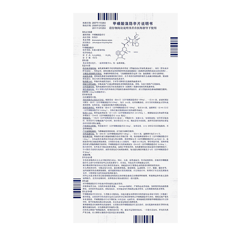 药品成份:本品活性成份及其化学名称:甲磺酸溴隐亭。